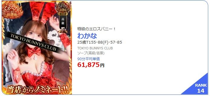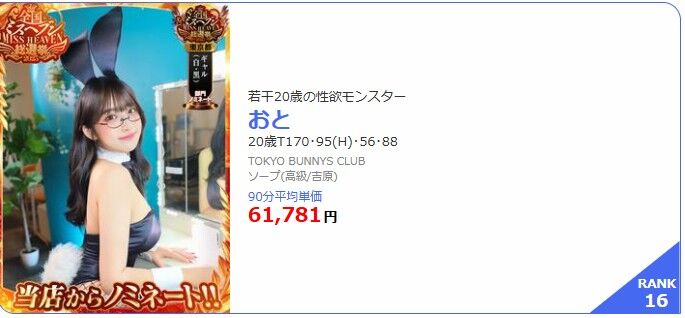 今月もやってまいりました!全国最高級嬢ランキング!10月版!当店からは8名ノミネート! 2025年10月21日 某サイトより毎月恒例の憧れの女性全国最高級嬢ランキング10月版が更新されTOKYOBUNNYSCLUBから8名が選出されました【ほんわか癒し系の特級エロスバニー】わかな(25)T:155 B:88(F) W:57 H:85【若さ溢れる博多弁美巨乳!】 おと(20)T:170 B:95(H) W:56 H:88【愛嬌抜群の敏感ロリバニー】あいみ(20)T:159 B:86(E) W:54 H:86【グラマラスで上品な雰囲気】さき(22)T:163 B:93(H) W:57 H:89【スタイル抜群Hカップ美巨乳】はるな(21)T:160 B:94(H) W:55 H:88【妖艶な腰つきの愛嬌モンスター】ほのか(21)T:161 B:85(D) W:54 H:85【淫乱体質のエステティシャン】ゆづき(24)T:159 B:84(F) W:54 H:85【二度見するほどの魅惑的なボディ】ましろ(24)T:165 B:105(I) W:56 H:88貴方様へ特別なる時、感動の出会いをご提供致しております~連日満員御礼~ありがとうございますTOKYOBUNNYSCLUB < 前の記事次の記事 >