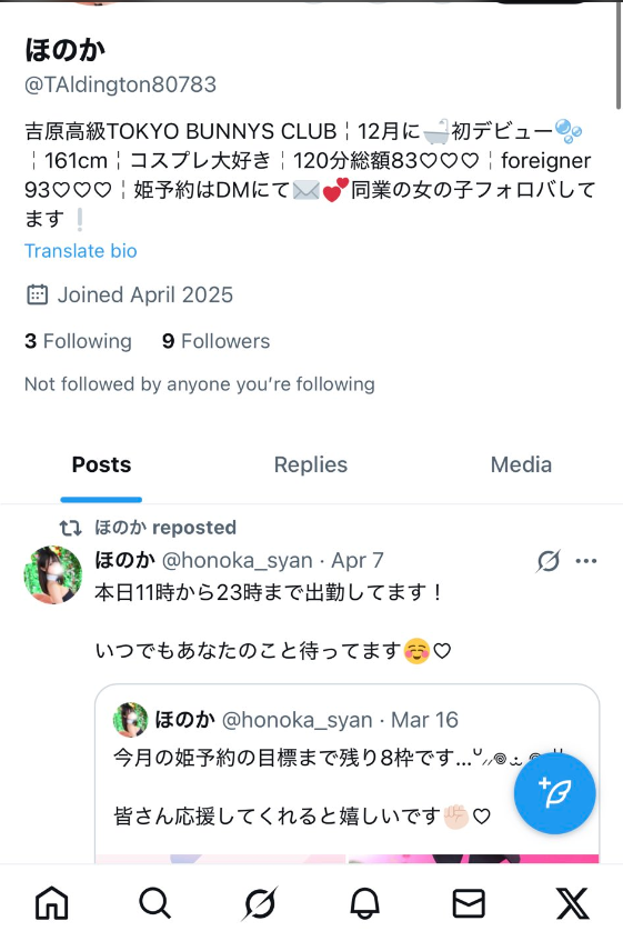 現在、XingFで始まるなりすましアカウント 2025年04月10日 当店の女性が被害にあわれました通報のご協力頂けましたら嬉しいです🥺✨宜しくお願い致します🙇最近、のなりすましアカウントがXやInstagram問わず増えてる感じが体感あるので皆様もお気をつけくださいませ。現在、XingFで始まるなりすましアカウントが増えているようです。皆様もご注意下さい。TOKYOBUNNYSCLUB < 前の記事次の記事 > コメント コメントフォーム 名前 コメント 記事の評価 リセット リセット 顔 星 情報を記憶 コメントを投稿する